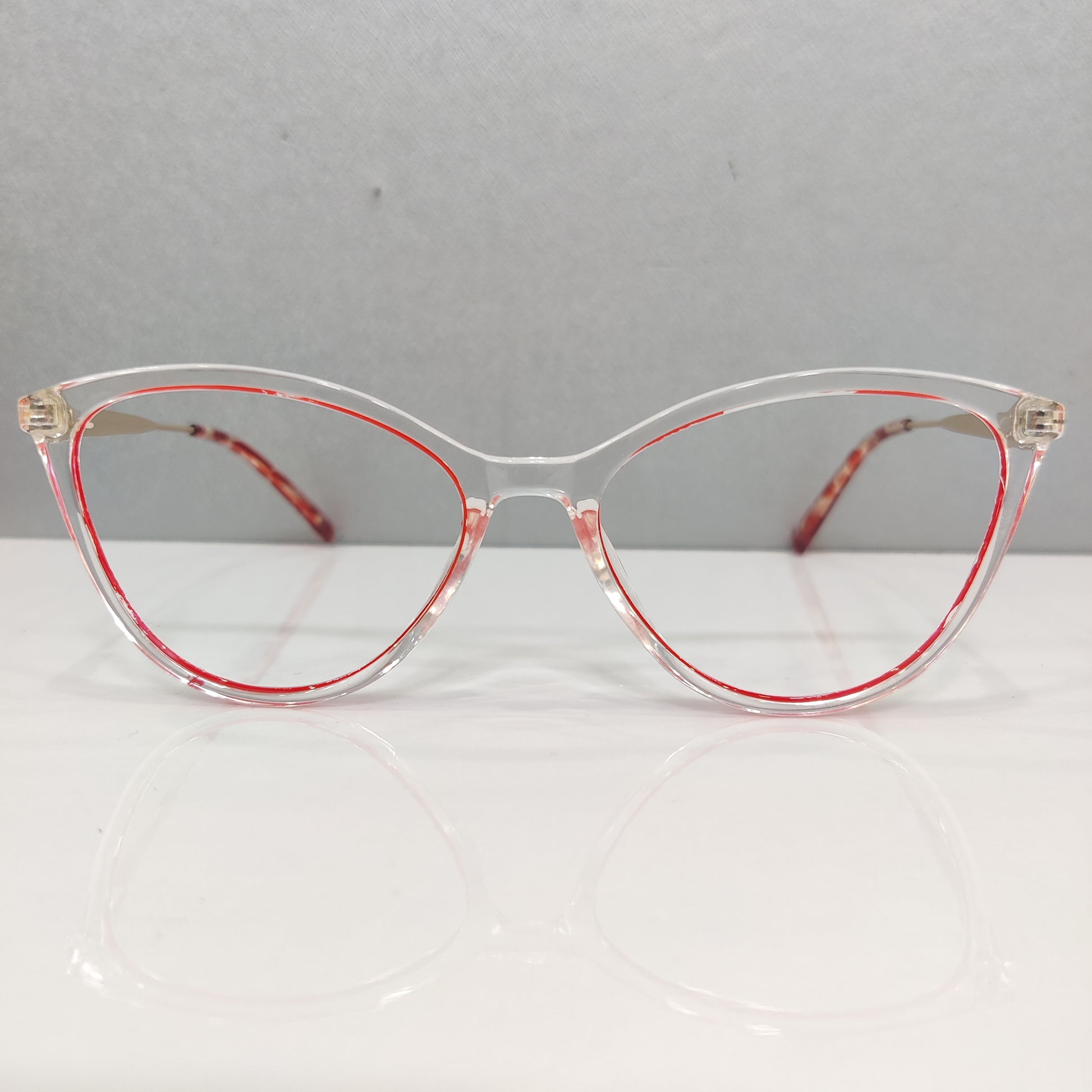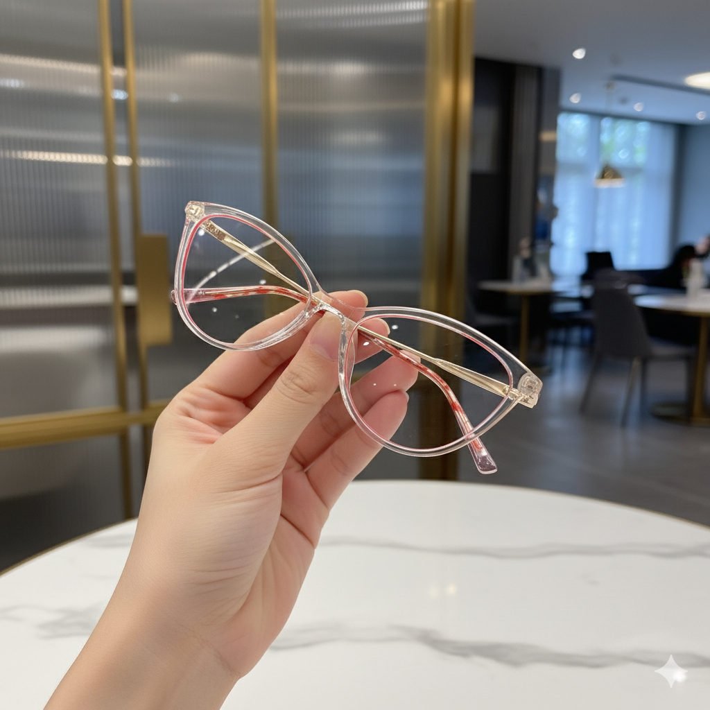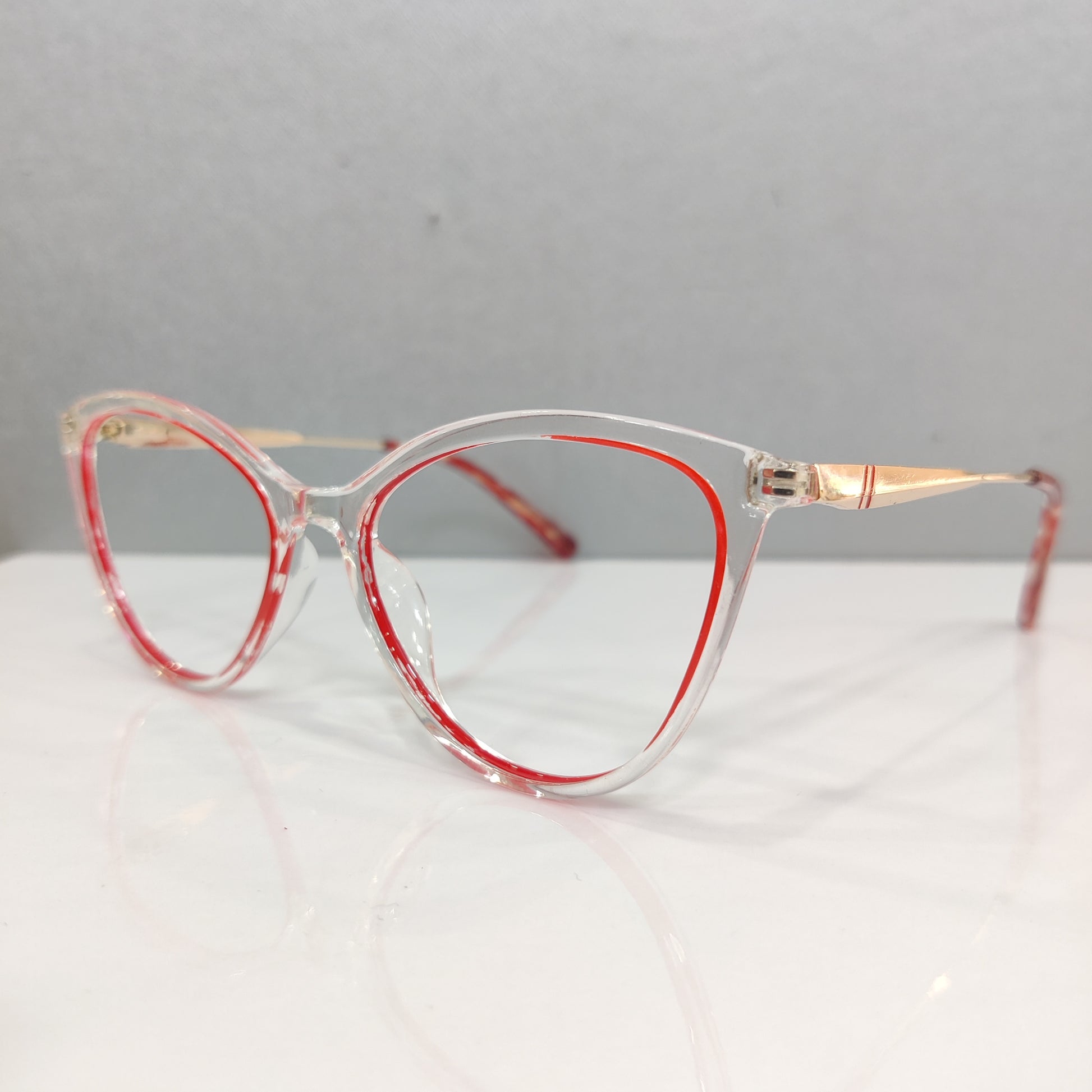 Step into effortless glamour with the Celestara, a women’s eyeglass frame designed to highlight both sophistication and individuality. Featuring a graceful cat-eye silhouette, the frame is crafted from clear premium plastic with subtle red accents, creating a striking yet delicate balance between modern chic and timeless femininity.